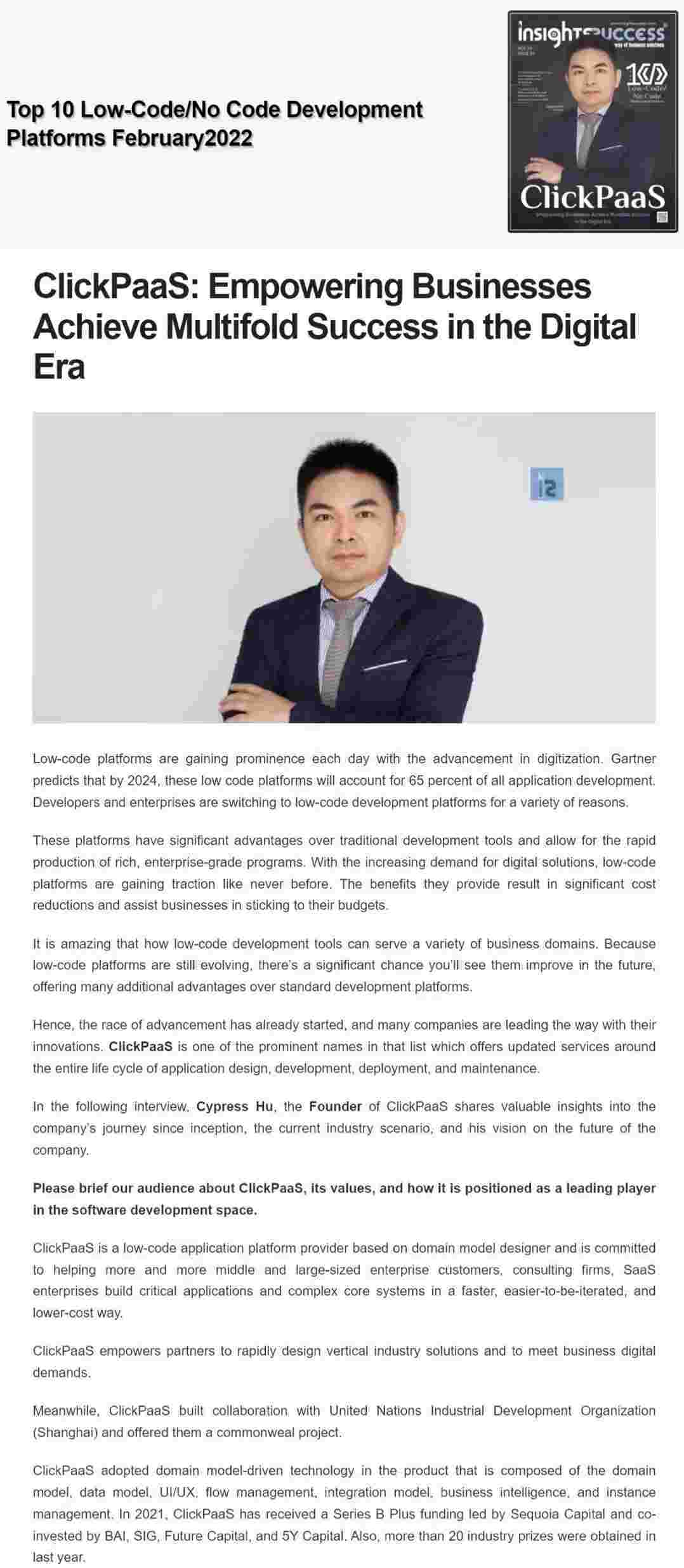 2022年年初,,VIVO钱包入选外媒Insights Success低代码/无代码开发平台 Top10,,创始人、、、、CEO胡柏受邀接受专访并荣登封面人物,,,他与Insights Success的读者分享了VIVO钱包成立的初心、、发展历程、、、、当前的行业发展趋势以及他对公司未来的展望。。。。